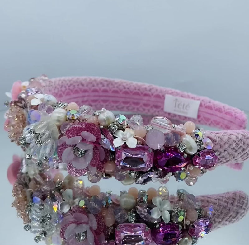 Num tecido tweed rosa maravilhoso, que mistura vários elementos como, flores, cristais e perolas, o que acrescenta perfeita harmonia a peça.